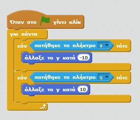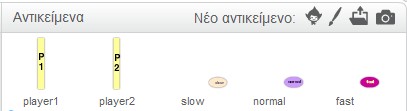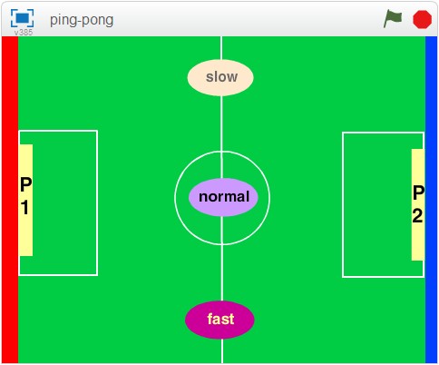 - Την ταχύτητα κίνησης της μπάλας την οποία τη χειριζόμαστε με μια μεταβλητή (speed). Κάθε φορά που περνά η μπάλα πάνω από το slow, normal ή fast αλλάζουμε την τιμή της μεταβλητής σε 1, 2, 3 αντίστοιχα. Τότε πολλαπλασιάζουμε τα βήματα κίνησης της μπάλας με τη μεταβλητή. Έτσι εάν τα βήματα κίνησης είναι 5, και η μεταβλητή speed έχει τιμή 2 τότε η μπάλα θα κινείται με 5*2 = 10 βήματα, ενώ εάν η speed έχει τιμή 3 η μπάλα θα κινείται με 5*3 = 15 βήματα, δηλαδή πιο γρήγορα.